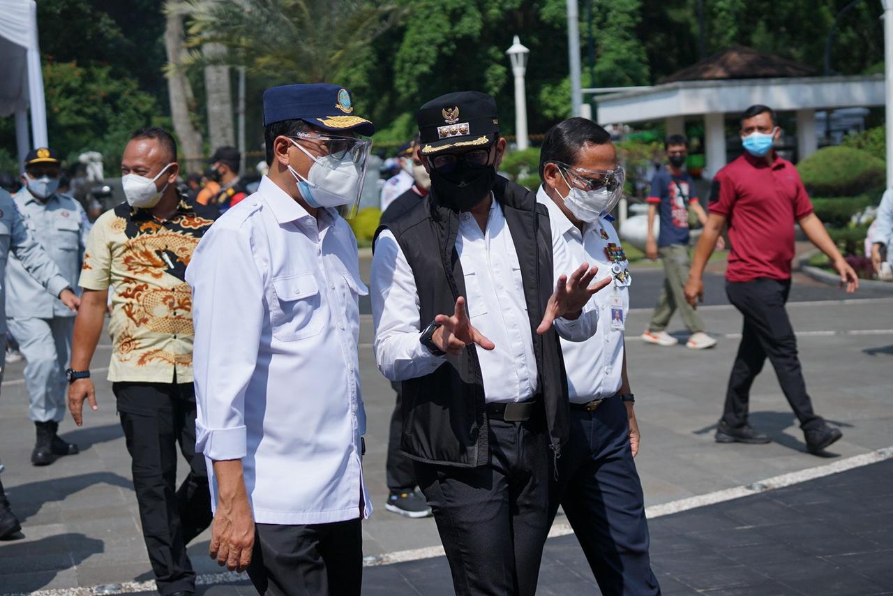 Menteri Koordinator (Menko) Bidang Perekonomian, Airlangga Hartarto dan Menteri Perhubungan (Menhub), Budi Karya Sumadi mendatangi Balai Kota Bogor, di Kecamatan Bogor Tengah, Minggu (25/7/2021).