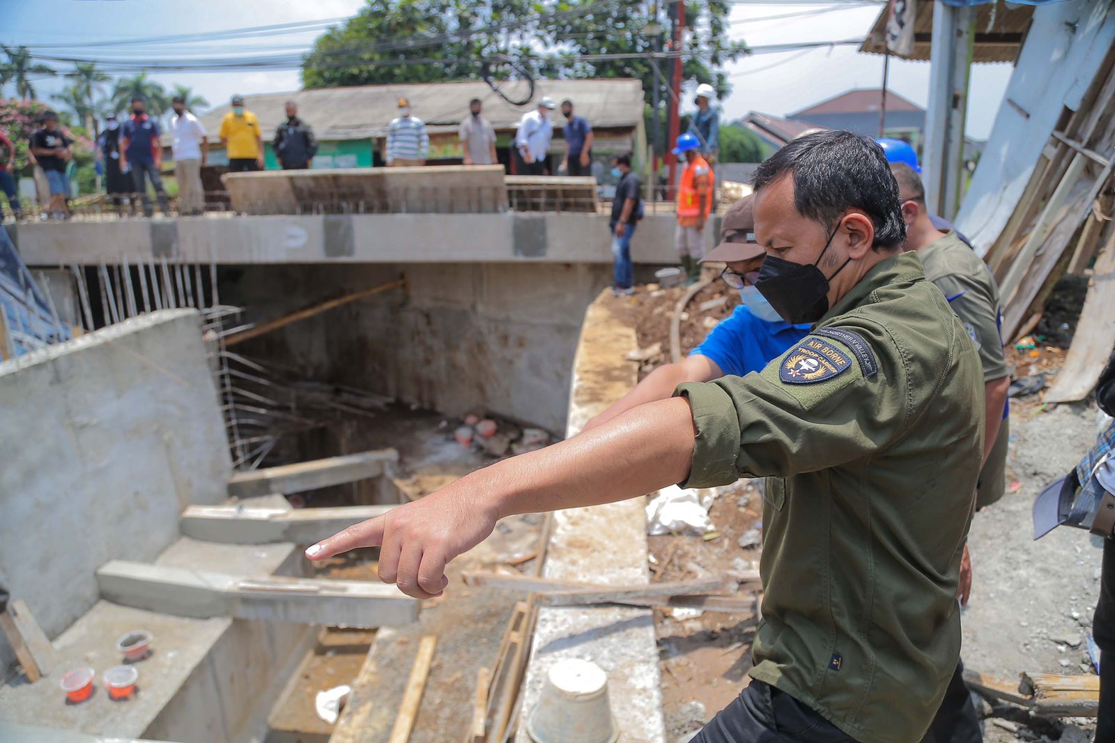 Sanga.id. Wali Kota Bogor Bima Arya meninjau pembangunan jembatan penghubung yang sebelumnya amblas karena longsor di Kelurahan Mekarwangi, Tanah Sareal, Minggu (10/10/2021). Dan menyebutkan secara keseluruhan proyek tersebut masih on the track dan akan rampung akhir Oktober 2021.