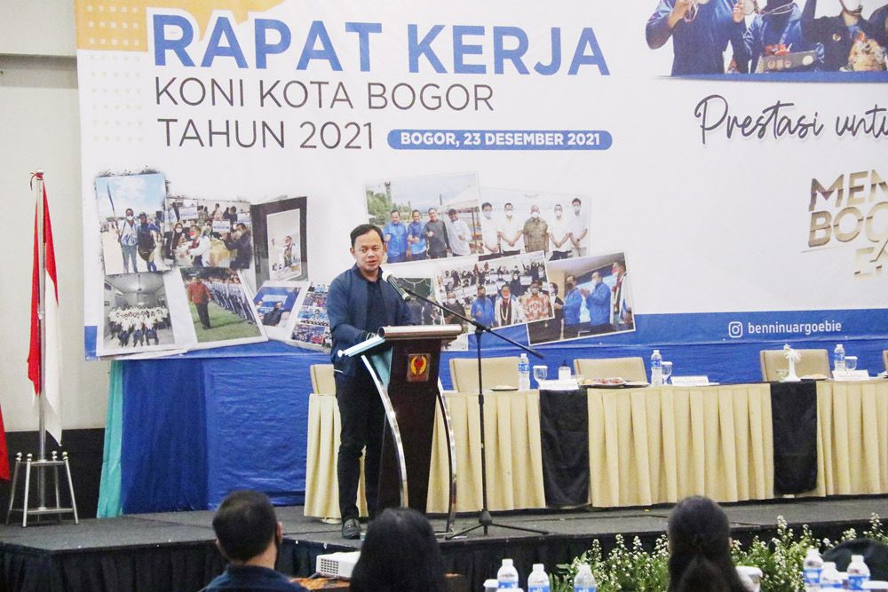 BOGOR. Komite Olahraga Nasional Indonesia (KONI) Kota Bogor menggelar Rapat Kerja (Raker) KONI Kota Bogor 2021 di Hotel Pajajaran Suites, Bogor Nirwana Residence (BNR), Kota Bogor, Kamis (23/12/2021). Pada raker ini KONI membahas berbagai hal termasuk menemukan program dan formula terbaik untuk menghadapi Pekan Olahraga Provinsi (Porprov) dan membawa 90 medali emas di Pekan Olahraga Daerah (Porda) 2022.