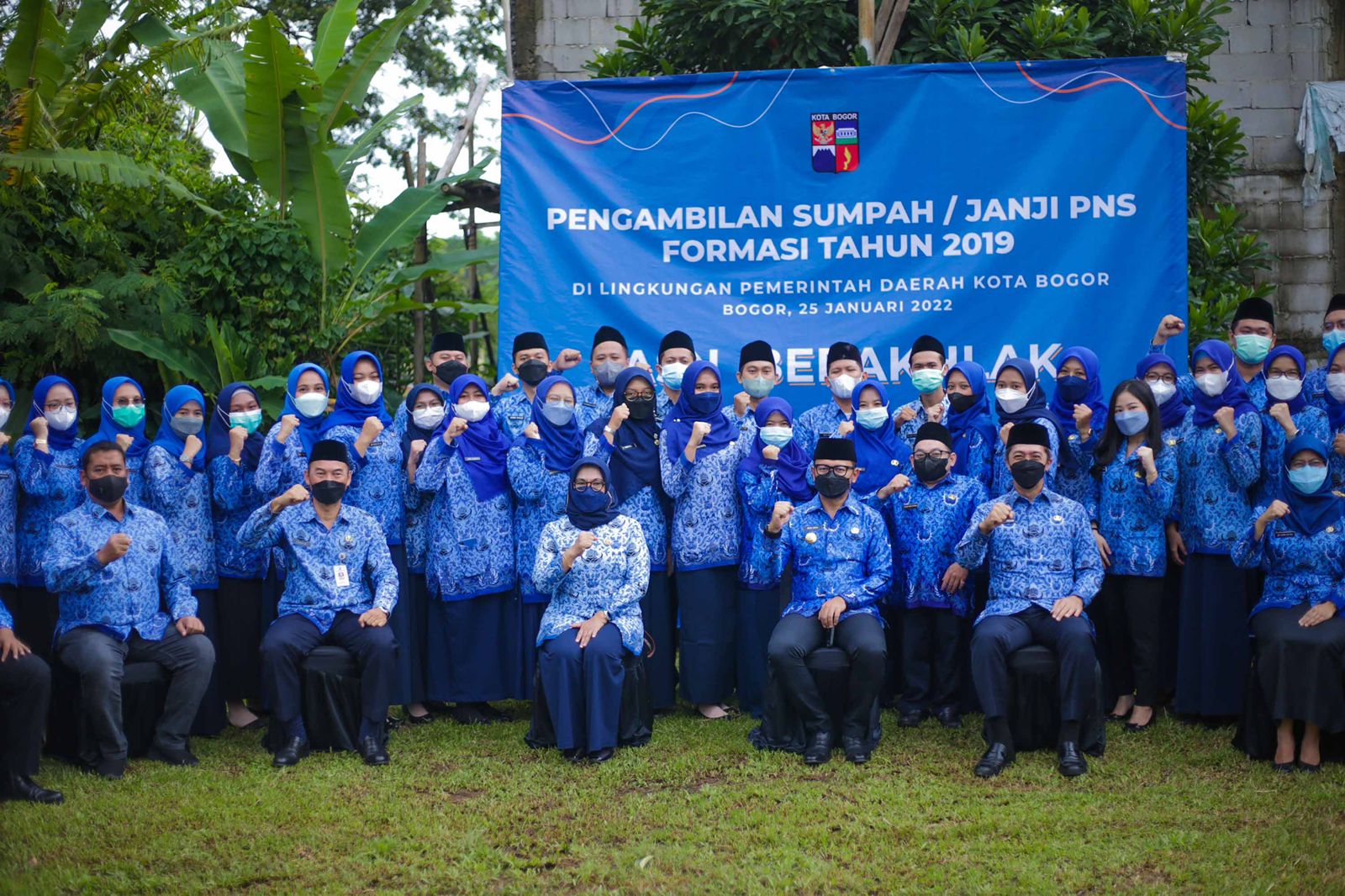 BOGOR. Wali Kota Bogor, Bima Arya secara langsung memimpin pengambilan sumpah/janji Pegawai Negeri Sipil (PNS) berlokasi di SDN Cimahpar 3 Kota Bogor, yang juga diikuti tiga lokasi lainnya secara daring, Selasa (25/1/2022).