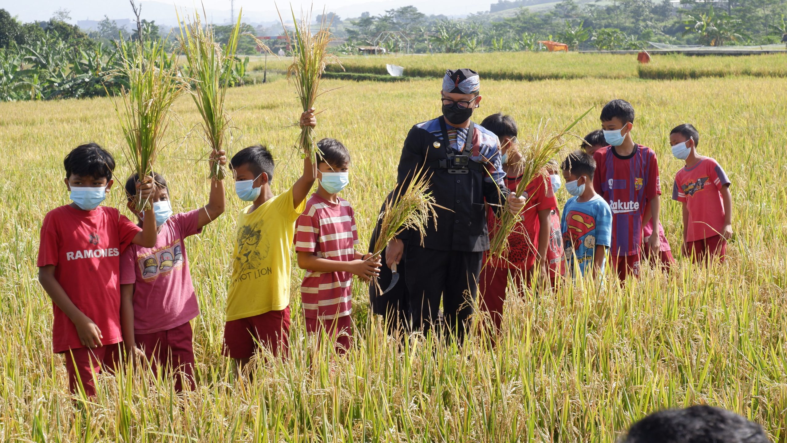 BOGOR. Wali Kota Bogor, Bima Arya ‘ngabeubeut’ padi bersama anak-anak di Agro Edukasi Wisata Organik (AEWO) Mulyaharja. Kegiatan ngabeubeut ini dalam rangka panen raya di lahan pertanian organik yang dikembangkan menjadi destinasi wisata dan edukasi kebanggaan Kota Bogor.