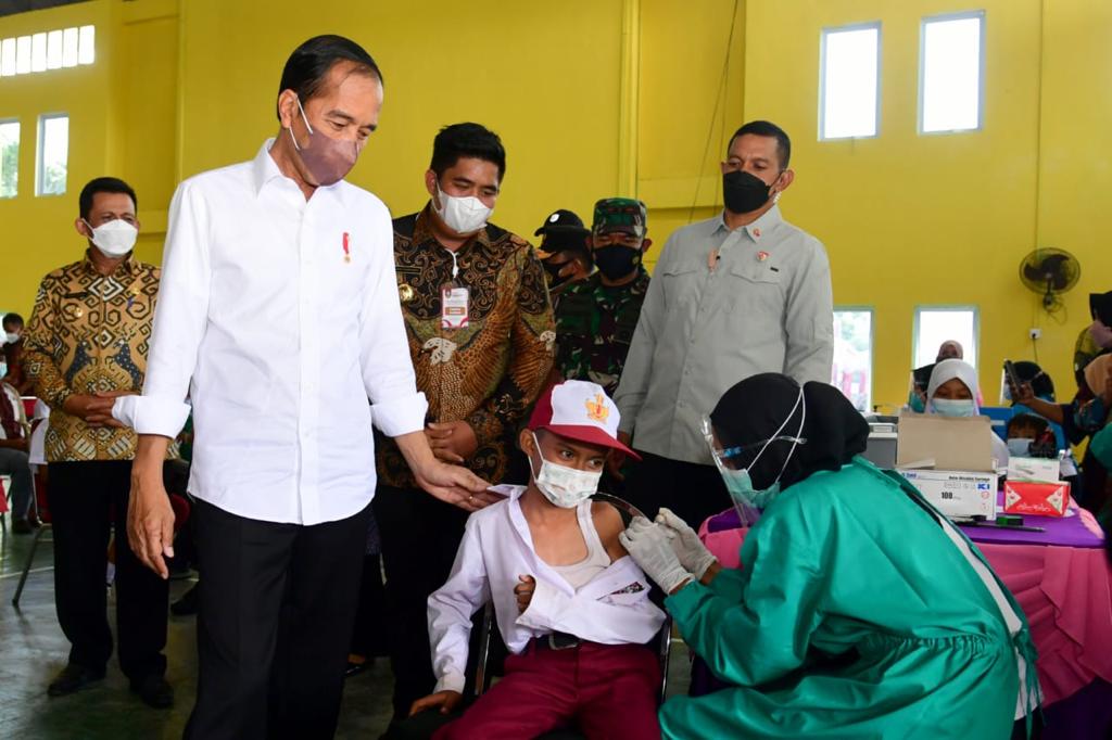 BINTAN. Presiden Joko Widodo meninjau kegiatan vaksinasi Covid-19 dosis ketiga _(booster)_ bagi para lansia dan dosis kedua untuk anak-anak, yang digelar di Gedung Community Center, Kota Baru, Kecamatan Teluk Sebong, Kabupaten Bintan, Provinsi Kepulauan Riau, pada Selasa, 25 Januari 2022. Presiden berharap agar vaksinasi tersebut dapat melindungi masyarakat dari paparan virus korona.