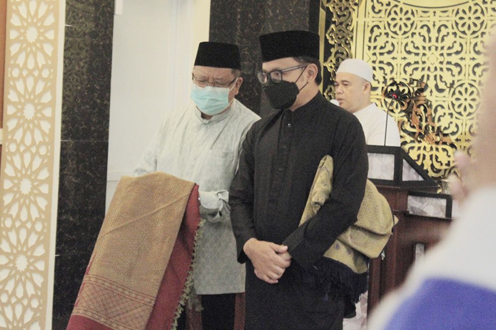 BOGOR. Memakai koko, sarung dan peci senada berwarna hitam, Wali Kota Bogor, Bima Arya bersama jajaran ASN Pemerintah Kota (Pemkot) Bogor melaksanakan salat subuh berjamaah di Masjid At-Taqwa, Balai Kota Bogor, Jumat (18/3/2022).
