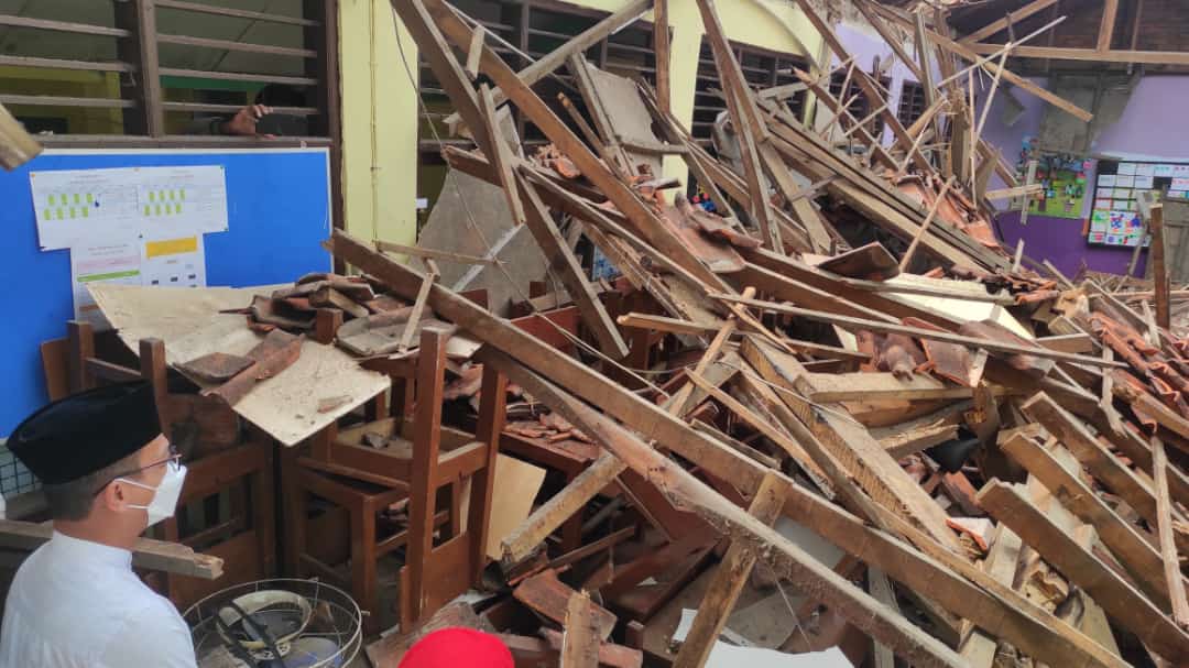BOGOR. Wakil Ketua III DPRD Kota Bogor, Eka Wardhana bersama Wakil Ketua Komisi IV, Said Muhammad Mohan, meninjau lokasi ambruknya atap ruang kelas di SDN 1 dan 2 Ciheuleut, Kelurahan Baranangsiang, Kecamatan Bogor Timur, Senin (28/3). Berdasarkan hasil peninjauan, diketahui ada dua atap ruang kelas yang ambruk akibat hujan deras dan kondisi bangunan yang sudah rapuh.