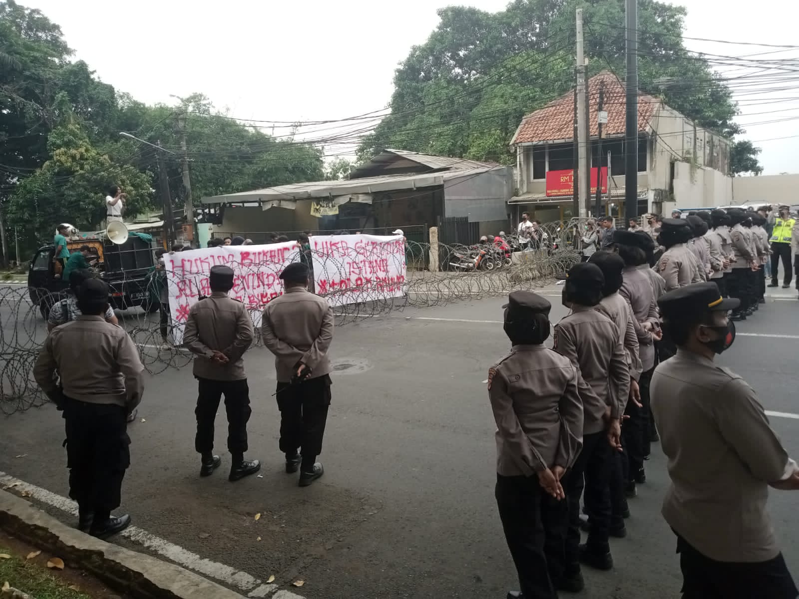 BOGOR. Puluhan mahasiswa dari Universitas Ibnu Khaldun (UIKA) Bogor menggelar demonstrasi terkait RKUHP, di sekitar Istana Kepresidenan Bogor, Jalan Jenderal Sudirman, Kota Bogor, pada Selasa (12/7/2022). Para mahasiswa dihadang petugas menggunakan kawat duri di Jalan Jenderal Sudirman. Setelah berorasi di atas mobil komando, mereka melanjutkan aksinya di gedung DPRD Kota Bogor.