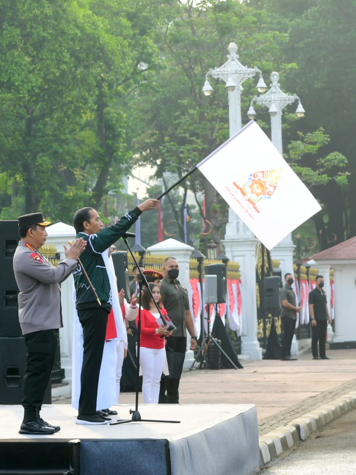 “Bersama-sama dengan Kapolri, bersama-sama dengan Habib Luthfi bin Yahya, dengan mengucap bismilillahirahmanirahim, pagi hari ini saya nyatakan Kirab Merah Putih diberangkatkan,” ucap Presiden.