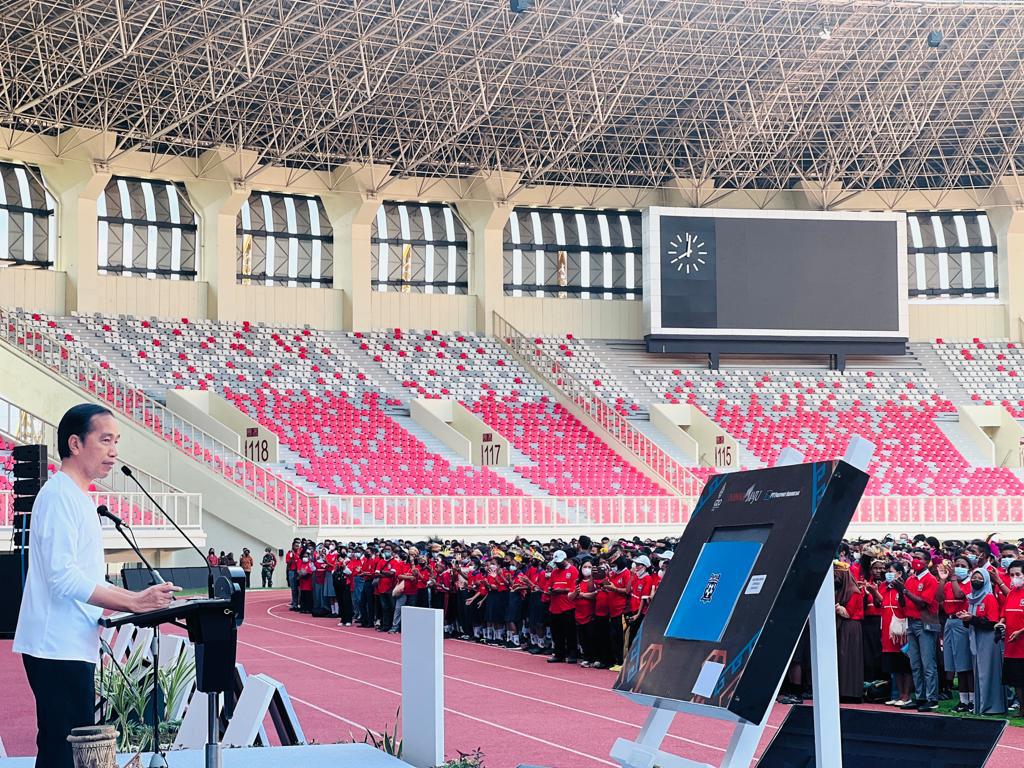 JAYAPURA. Mengawali kunjungan kerjanya di Provinsi Papua, Presiden Joko Widodo didampingi Ibu Iriana Joko Widodo meluncurkan Papua Football Academy (PFA) di Stadion Lukas Enembe, Kabupaten Jayapura, Rabu, 31 Agustus 2022. Dalam sambutannya, Presiden mengapresiasi terbentuknya akademi tersebut guna melahirkan talenta-talenta berbakat lainnya dari tanah Papua yang dikenal telah melahirkan banyak talenta sepak bola.