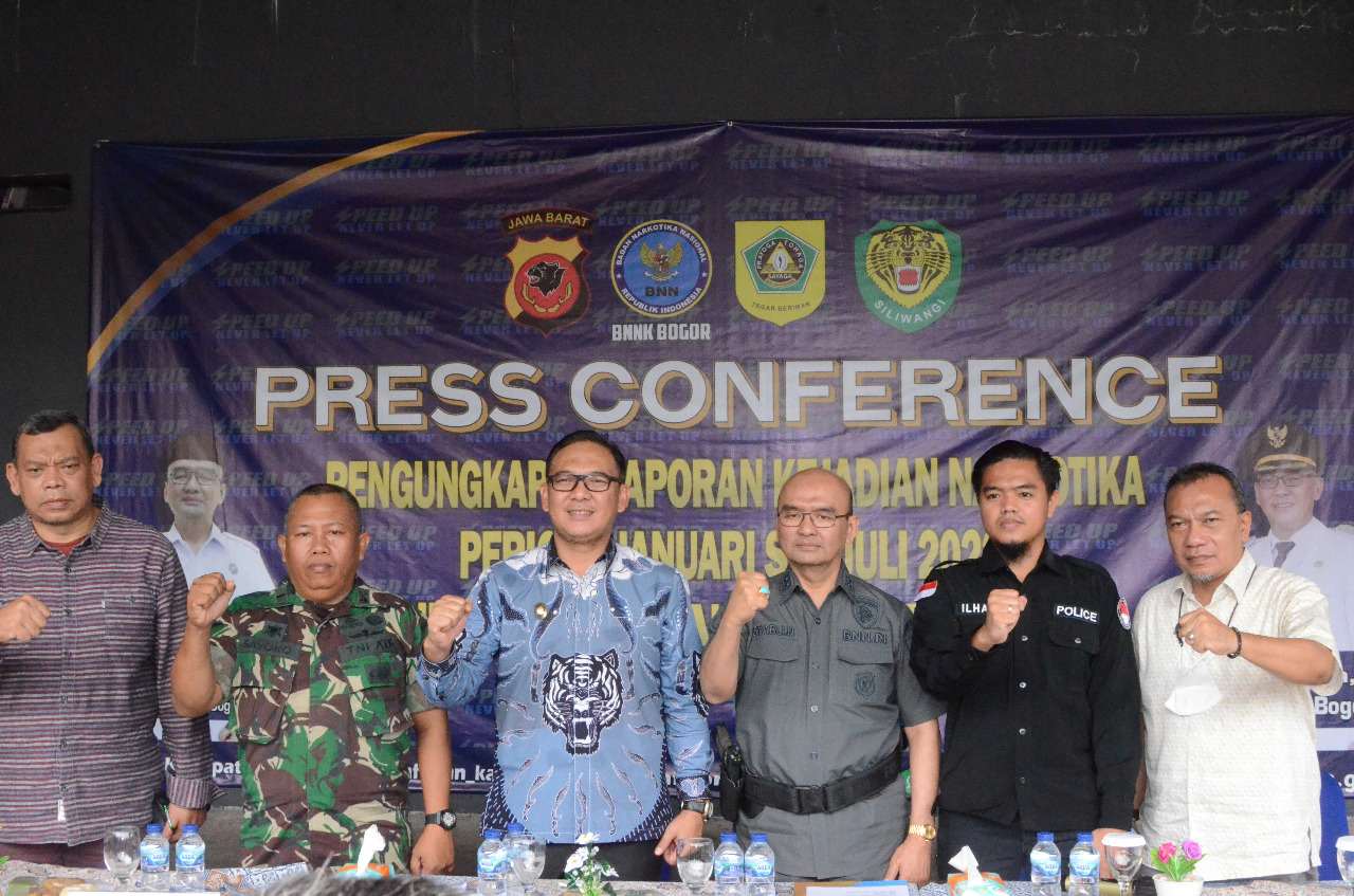BOGOR. Badan Narkotika Nasional Kabupaten ( BNNK ) Bogor berhasil menjaring dan mengungkap kasus peredaran narkotika di wilayah Kabupaten Bogor selama tahun 2022 dan membuat Plt. Bupati Bogor Iwan Setiawan merasa optimis dapat mendorong terwujudnya Kabupaten Bogor Bersih dari Narkoba (Bersinar). Hal itu ditegaskan Plt. Bupati Bogor saat menghadiri kegiatan Press Conference Pengungkapan Laporan Kejadian Narkotika yang berlangsung di Kantor BNN Kabupaten Bogor, Jumat (5/8/22).