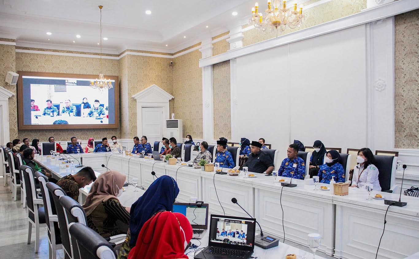 Wali Kota Bogor, Bima Arya didampingi sejumlah kepala perangkat daerah lingkup Pemerintah Kota (Pemkot) Bogor menerima tim penilai yang diketuai Dede Purnama di Paseban Sri Bima, Balai Kota Bogor, Senin (17/10/2022).