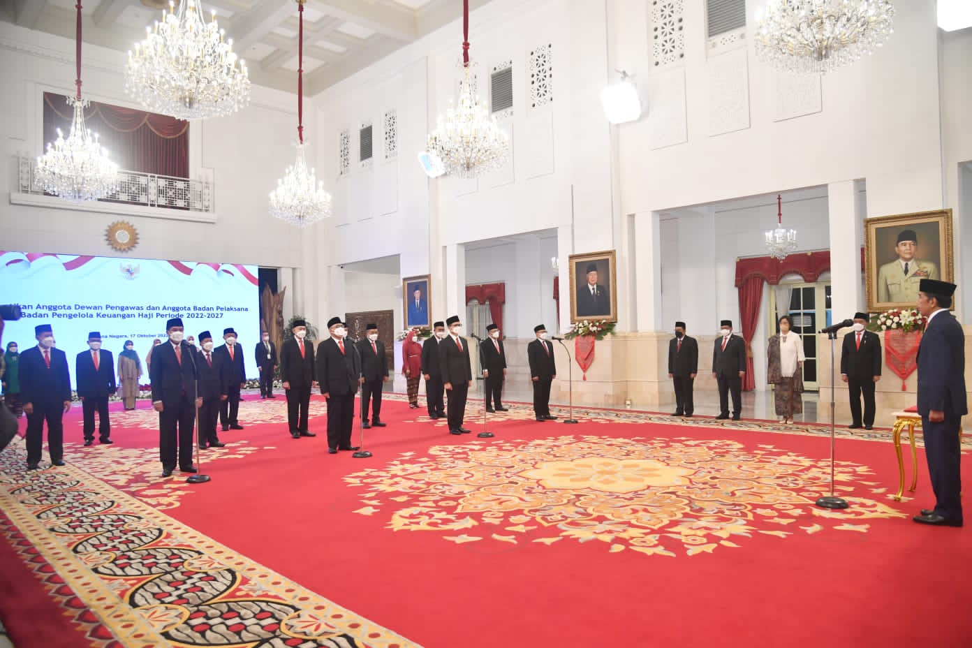 JAKARTA. Presiden Joko Widodo melantik dan mengambil sumpah jabatan Anggota Dewan Pengawas Badan Pengelola Keuangan Haji (BPKH) dan Anggota BPKH periode 2022-2027. Acara pelantikan berlangsung di Istana Negara, Jakarta, pada Senin, 17 Oktober 2022.