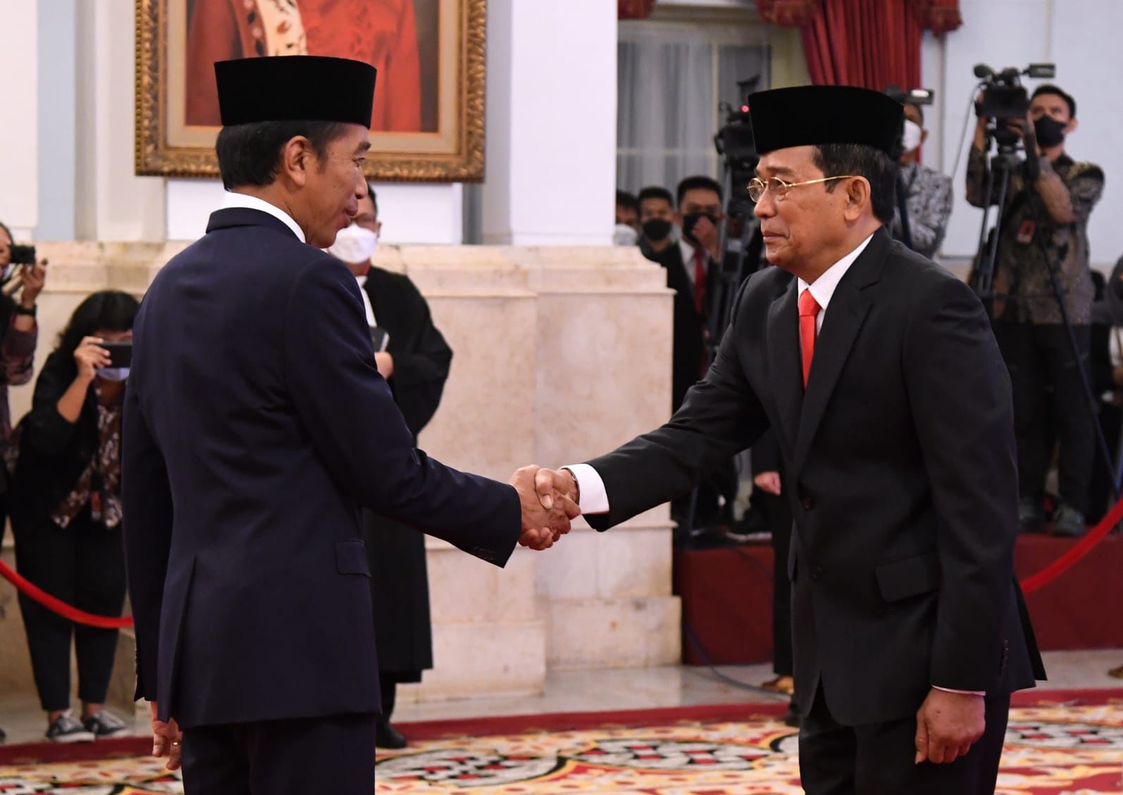“Saya berjanji bahwa saya akan setia kepada dan akan mempertahankan serta mengamalkan Pancasila sebagai dasar negara, Undang-Undang Dasar Negara Republik Indonesia Tahun 1945 serta peraturan perundang-undangan yang berlaku bagi Negara Republik Indonesia,” ujar Johanis Tanak membacakan penggalan janji di hadapan Presiden Jokowi.
