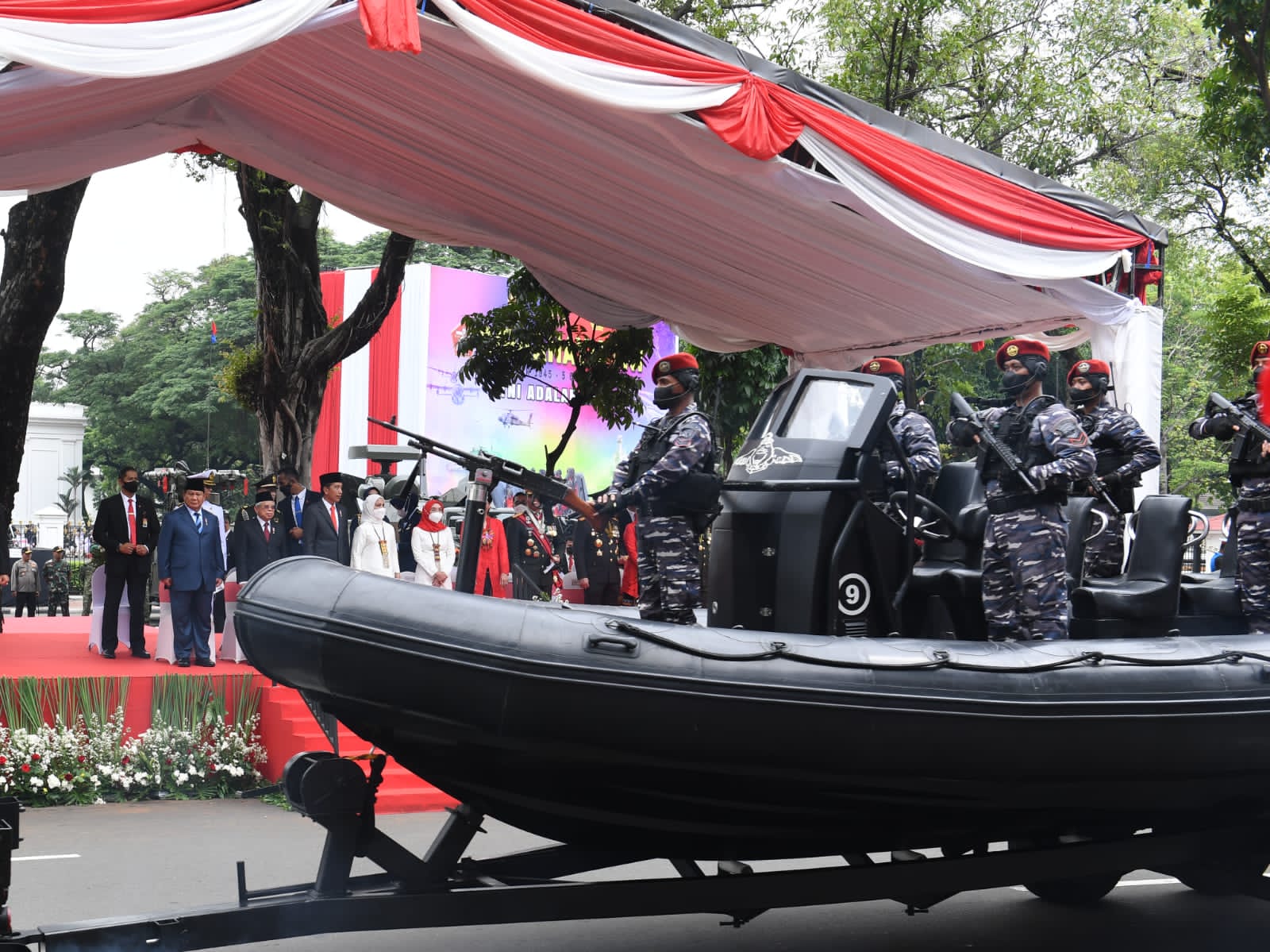 JAKARTA. Presiden Joko Widodo beserta Ibu Iriana Joko Widodo dan Wakil Presiden Republik Indonesia beserta Ibu Wury Ma’ruf Amin menyaksikan defile pasukan dan pawai alat utama sistem persenjataan (alutsista) yang digelar di jalan sekitar Istana Kepresidenan Jakarta, pada Rabu, 5 Oktober 2022. Defile dan pawai alutsista tersebut digelar selepas upacara peringatan ke-77 Hari TNI.
