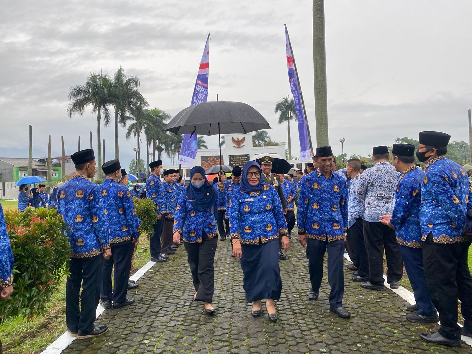 BOGOR. Kondisi cuaca di Kota Bogor yang diguyur hujan sejak malam dan pagi hari tak menyurutkan semangat dari Aparatur Sipil Negara (ASN) di Kota Bogor untuk melaksanakan upacara Hari Ulang Tahun (HUT) Korpri ke-51 di Taman Makam Pahlawan Dreded, Jalan Pahlawan, Kecamatan Bogor Selatan, Kamis (17/11/2022).