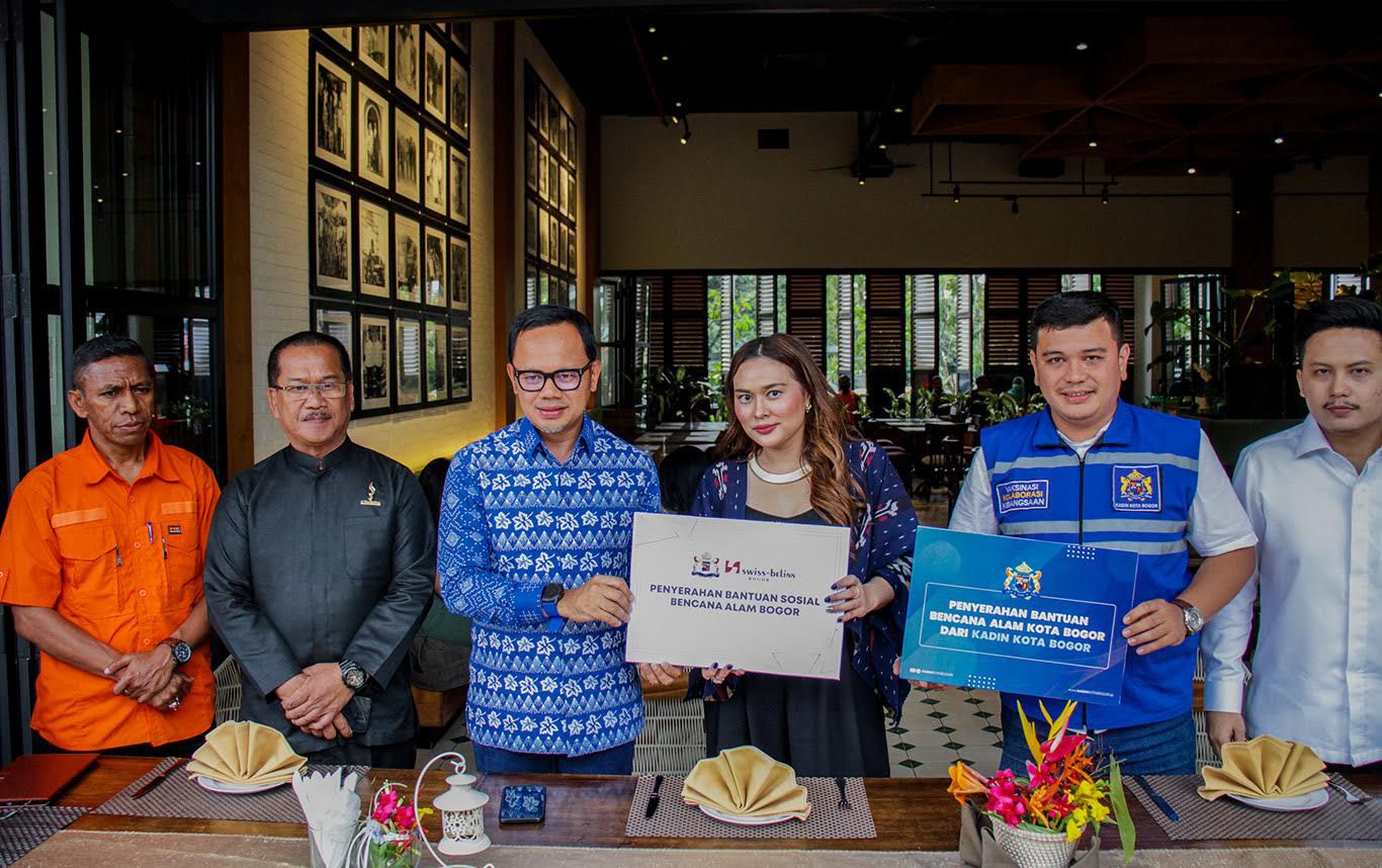 Penyerahan bantuan secara simbolis diserahkan Direktur Swiss-Belinn Bogor, Karina Soerbakti yang juga Wakil Ketua Bidang Daya Saing Usaha Kadin Kota Bogor serta Wakil Ketua Bidang Organisasi, Felix Martha kepada Wali Kota Bogor, Bima Arya di Swiss-Belinn Bogor, Jalan Pajajaran Indah V, Kecamatan Bogor Timur, Kota Bogor, Jumat (4/11/2022).
